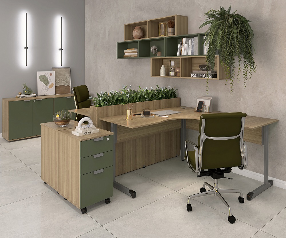 Conjunto composto por mesas em L, gaveteiros volante, nichos, floreira e armários baixo.