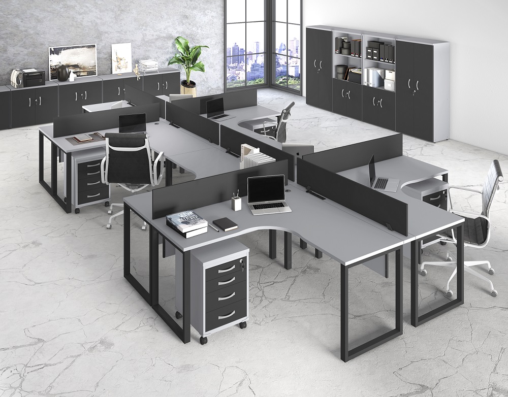 Conjunto composto por mesas em L, conexões passa fio e tomadas com biombos divisores, gaveteiros volante e diversos modelos de armários.